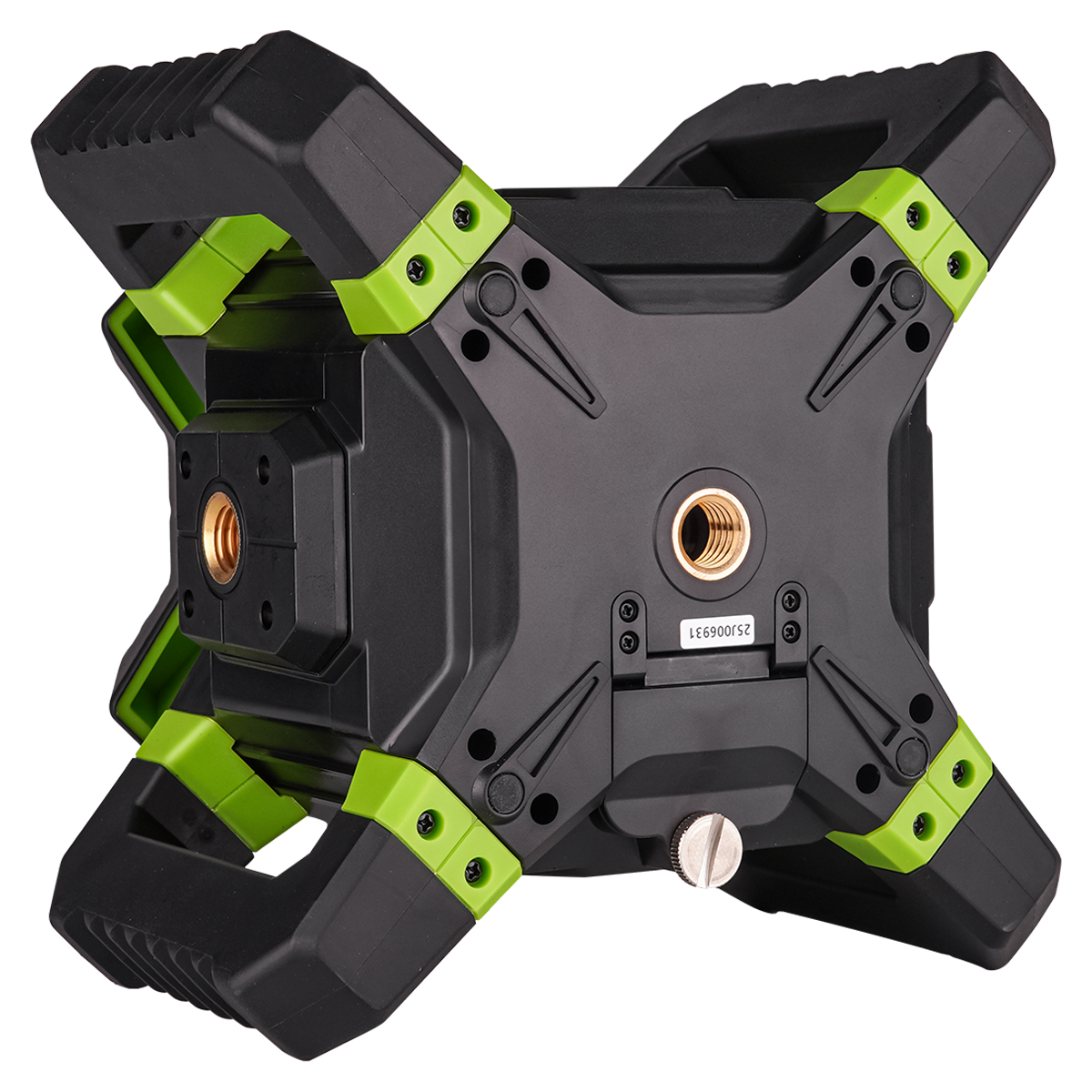 - 4 боковые ручки, благодаря параллельному расположению, позволяют устанавливать ротационный нивелир на любых горизонтальных поверхностях для проецирования отвесной плоскости при боковом выравнивании, исключая необходимость обязательного задействования штатива.