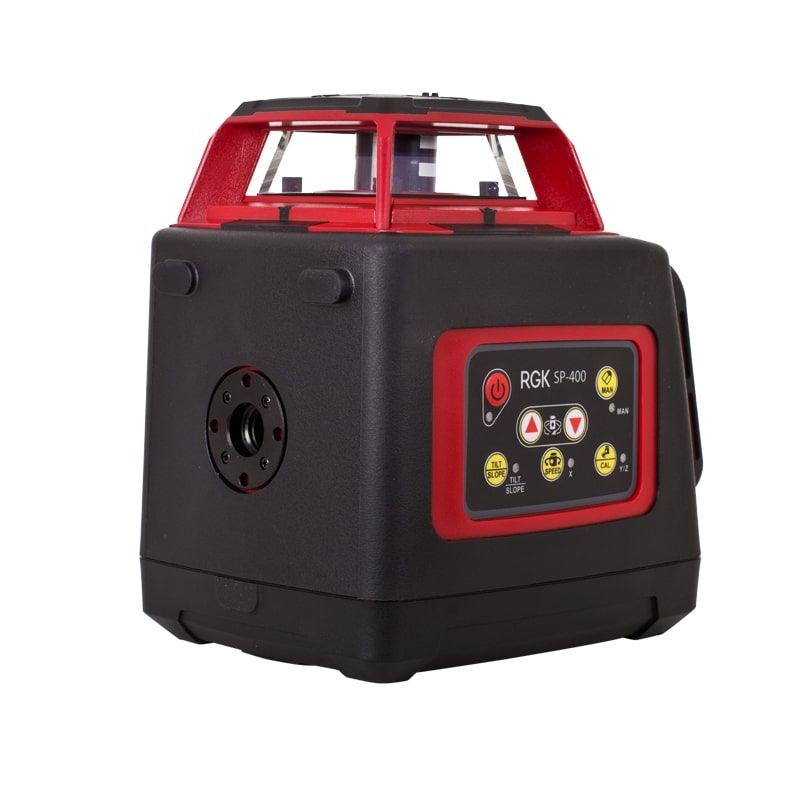 Ротационный нивелир RGK SP-400 предназначен для работы с приёмником на расстоянии до 400 метров. Точность горизонтальной плоскости ±1 мм на 10 м, а вертикальной — ±1,5 мм на 10 м. Выравнивание выполняется с помощью сервоприводов в диапазоне ±5°. При выходе за пределы автовыравнивания лазер остановит вращение и отключится.