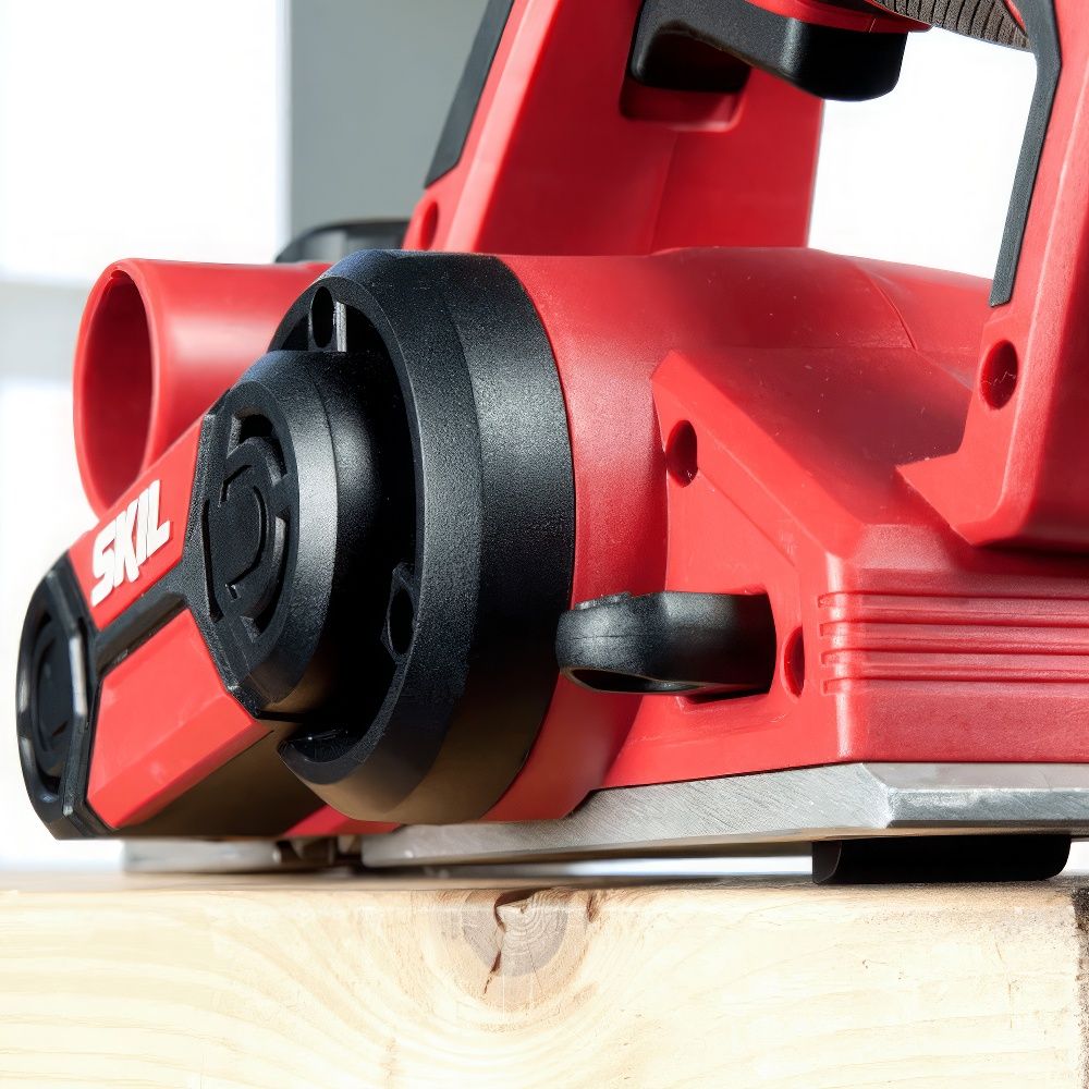Для поддержания чистоты на рабочем месте SKIL PL2012 оснащён системой выброса стружки с двух сторон — вправо или влево, в зависимости от положения оператора. Можно подключить пылесборник или строительный пылесос. Удобная откидная подставка защищает заготовку и ножи от случайных повреждений при постановке инструмента на поверхность.