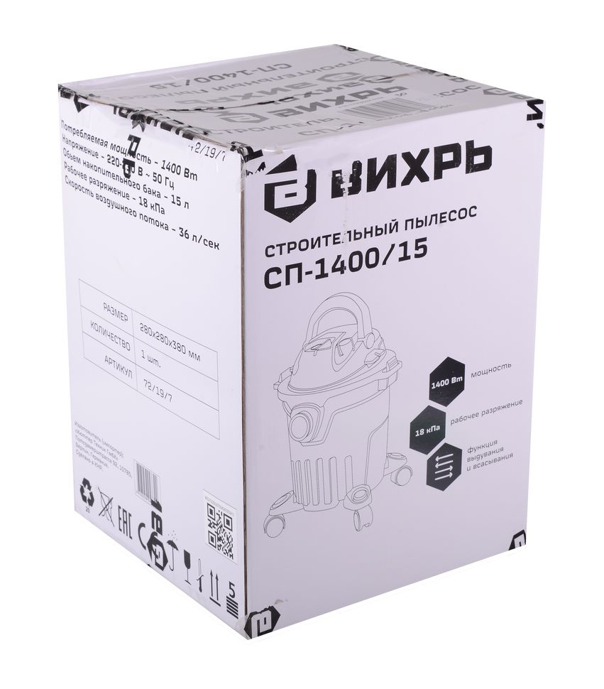 1400 Вт, 15 л, 36 л/сек, влажная уборка, выдув