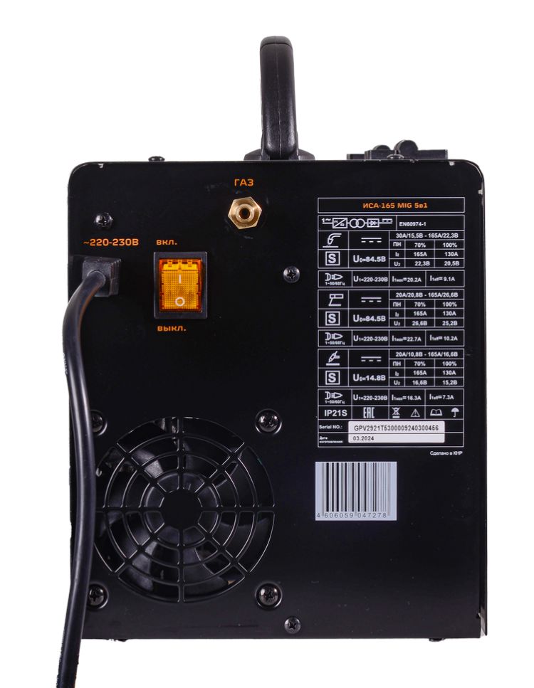- На задней части устройства расположена рукоятка регулировки величины сварочного тока. Он может варьироваться в диапазоне от 30 до 165 А.