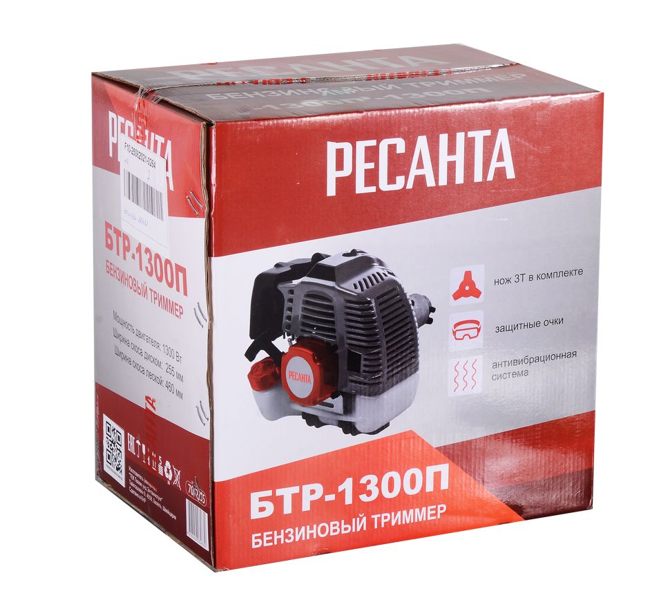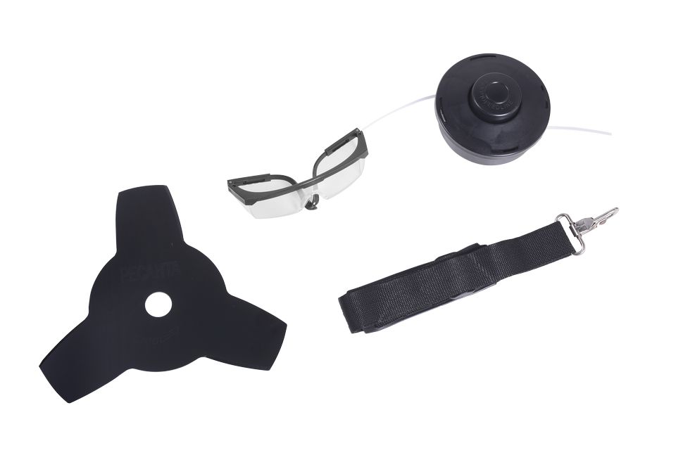 Паспорт изделия, Двигатель в сборе, Штанга в сборе с редуктором, Защитный кожух, Режущий диск, Катушка с леской, Рукоятки управления (левая и правая), Наплечный ремень, Комплект ключей, Защитные очки