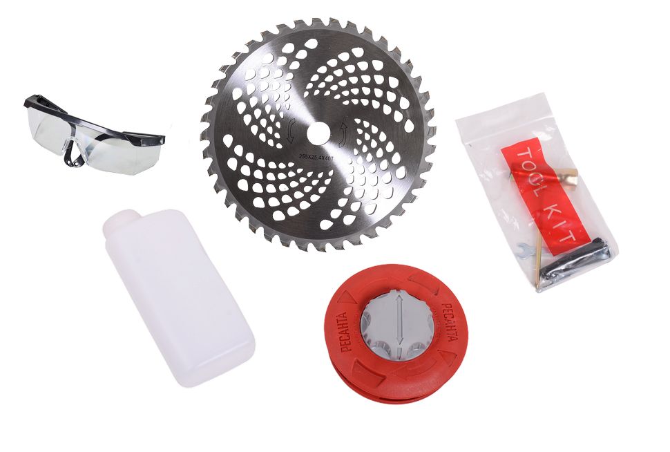 Паспорт изделия, Двигатель в сборе, Штанга в сборе с редуктором, Защитный кожух, Режущий диск, Катушка с леской, Рукоятки управления (левая и правая), Комплект ключей, Ранцевый ремень, Защитные очки