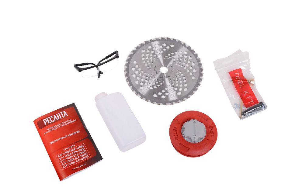 Паспорт изделия, Двигатель в сборе, Защитный кожух, Режущий диск, Катушка с леской, Рукоятки управления (левая и правая), Комплект ключей, Штанга в разборе, Ранцевый ремень, Защитные очки
